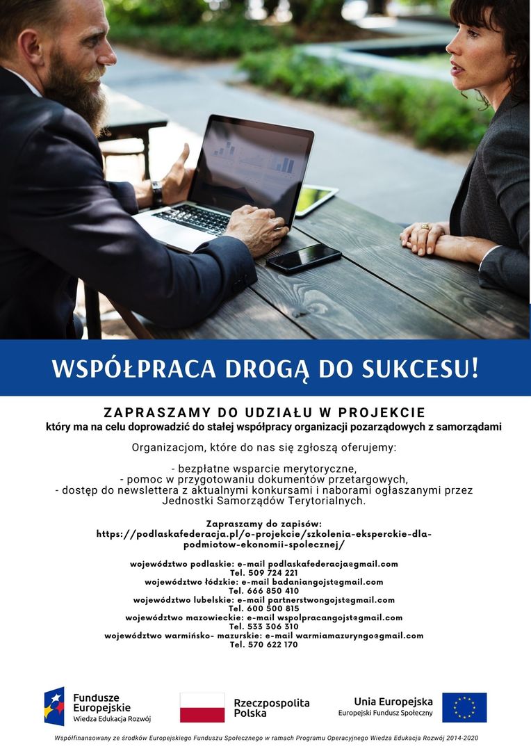 Podlaska Federacja Organizacji Pozarządowych serdecznie zaprasza Podmioty Ekonomii Społecznej z woj. mazowieckiego w tym Przedsiębiorstwa Społeczne, Fundacje, Stowarzyszenia, Spółdzielnie Socjalne, Ochotnicze Straże Pożarne, Koła Gospodyń Wiejskich do udziału w projekcie pn. „Szkolenia eksperckie dla Podmiotów Ekonomii Społecznej z zakresu zamówień publicznych w województwie podlaskim, warmińsko-mazurskim, lubelskim, mazowieckim i łódzkim", realizowanym w ramach Programu Operacyjnego Wiedza Edukacja Rozwój, Działanie 2.9 Rozwój ekonomii społecznej, tj. https://podlaskafederacja.pl/o-projekcie/szkolenia-eksperckie-dla-podmiotow-ekonomii-spolecznej/.