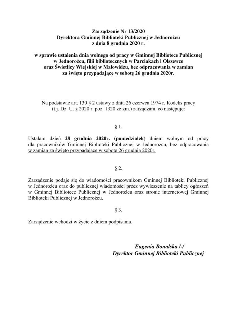 Gminna Biblioteka Publiczna w Jednorożcu, filie biblioteczne w Parciakach i Olszewce oraz Świetlica Wiejska w Małowidzu 28.12.2020r. (poniedziałek) BĘDĄ NIECZYNNE